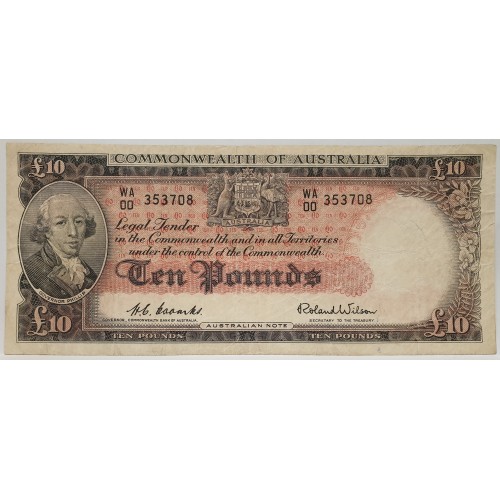 Australia 1954. Ten 10 Pounds Banknote. Serial: WA000 353708. Coombs/Wilson.