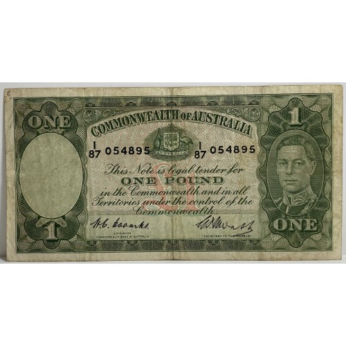 Australia 1949 One 1 Pound Banknote. Serial: I87 054895. Coombs/Watts. Very