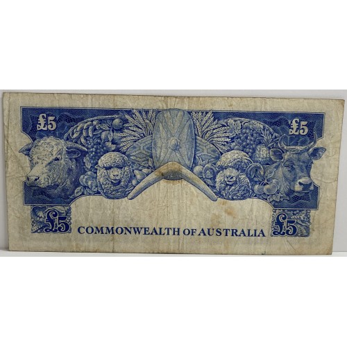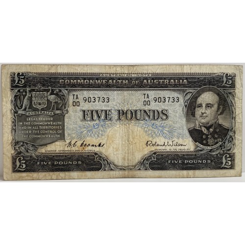 Australia 1954 Five 5 Pound Banknote. Serial: TA00 903733. Coombs/Wilson.