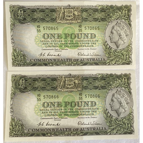 Australia 1953 One 1 Pound Banknotes. Serial: HD55 / 570865-6. Coombs/Wilson.