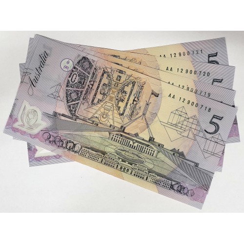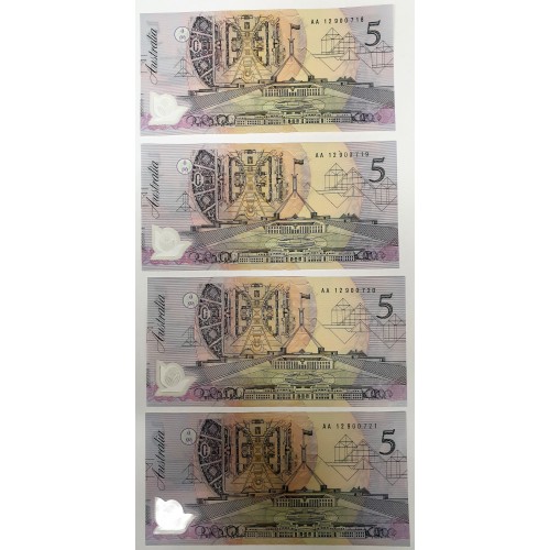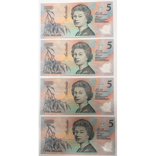 Australia 1992. Five 5 Dollar Banknote.Cole/Fraser. Serial: AA12900718-21.