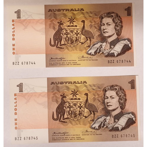 Australia 1976. One 1 Dollar Banknotes. Serial: BZZ678741-5. Knight/Wheeler.