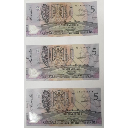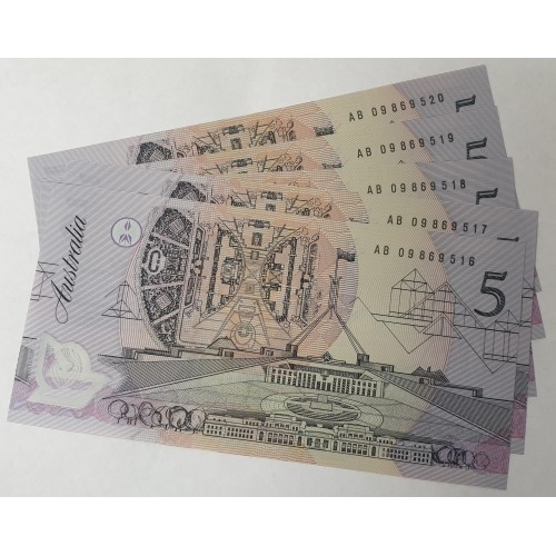 Australia 2009. Five 5 Dollar Banknotes. Serial: AB09869516-20. Fraser/Cole.