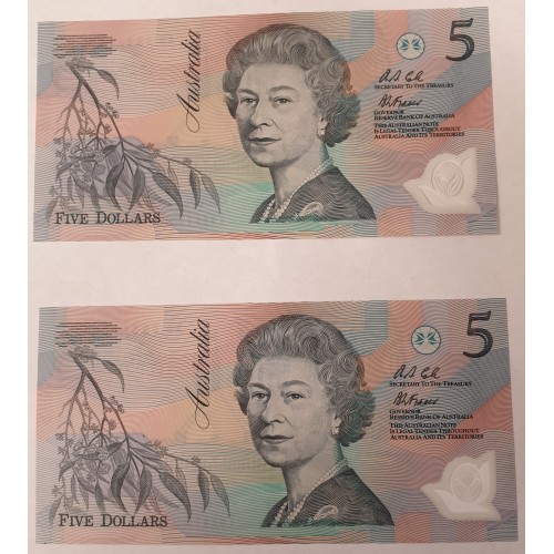 AUSTRALIA 2009 . FIVE 5 DOLLAR BANKNOTES . FRASER/COLE . CONSECUTIVE FIVE