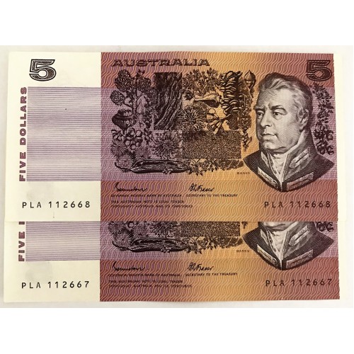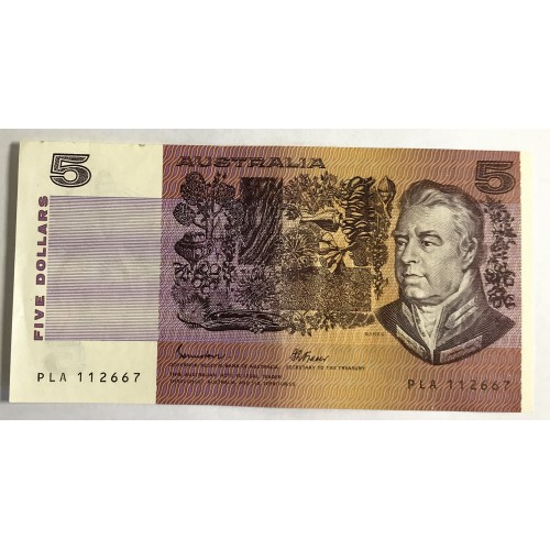 Australia 1985. Five 5 Dollars Banknote. Serial: PLA112667-8. Johnston/Fraser.
