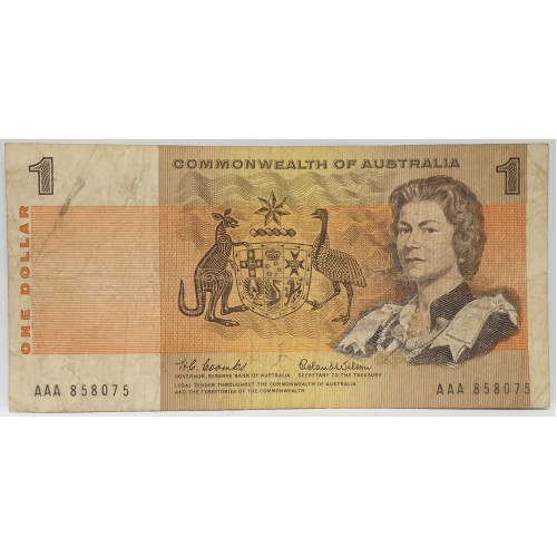 Australia 1966 One 1 Dollar Banknote. Serial: AAA858075. Coombs/Wilson.