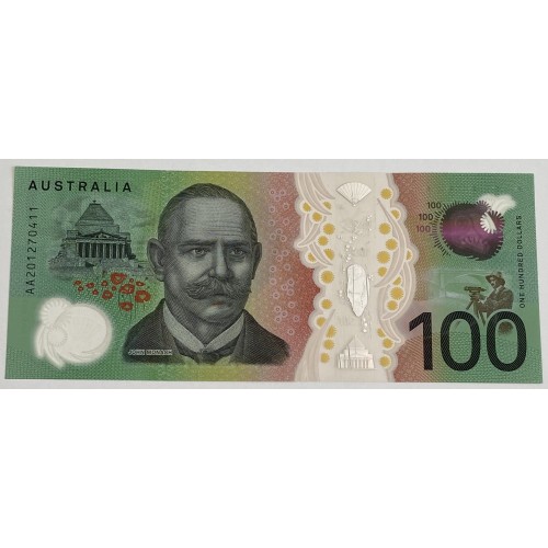 Australia 2020 One Hundred 100 Dollars Banknote. Serial: AA201270411.