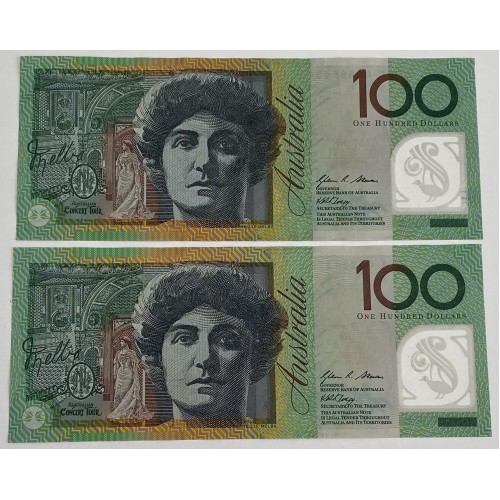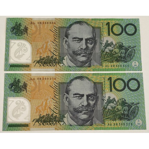 AUSTRALIA 2008 . ONE HUNDRED 100 DOLLARS BANKNOTES . STEVENS/HENRY . FIRST and LAST PREFIX