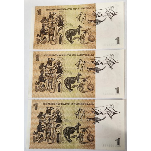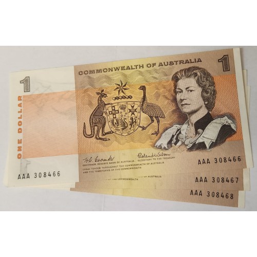 AUSTRALIA 1966 . ONE 1 DOLLAR BANKNOTES . COOMBS/WILSON . CONSEC TRIO . FIRST PREFIX AAA