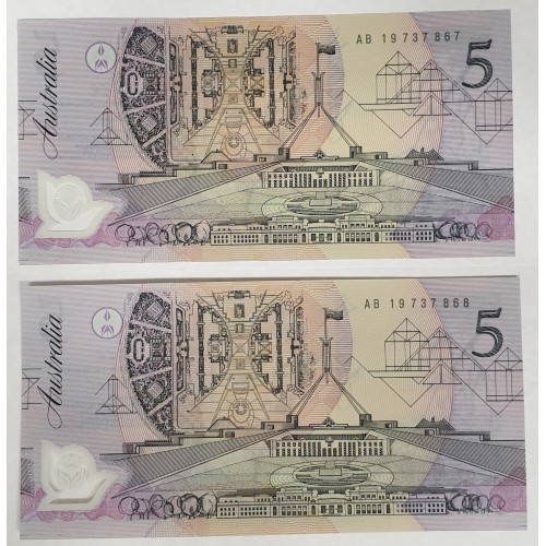AUSTRALIA 1992 . FIVE 5 DOLLAR BANKNOTES . COLE/FRASER . CONSECUTIVE PAIR . LAST PREFIX AB19