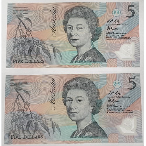 Australia 1992. Five 5 Dollar Banknotes. Cole/Fraser. Serial: AB19737867-8.