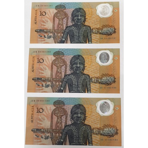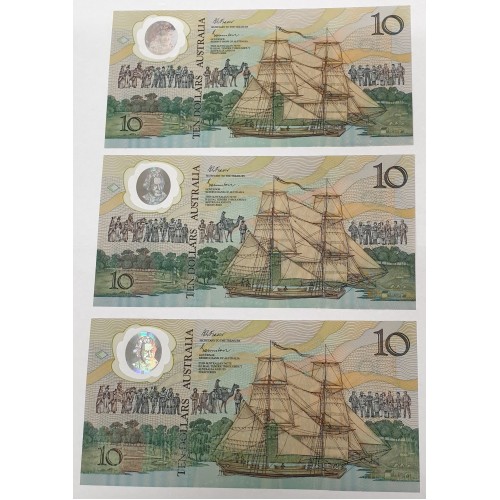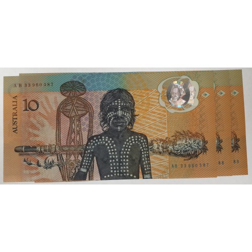 AUSTRALIA 1988 . TEN 10 DOLLAR BANKNOTES . FRASER/JOHNSTON . CONSECUTIVE TRIO . LAST PREFIX AB33