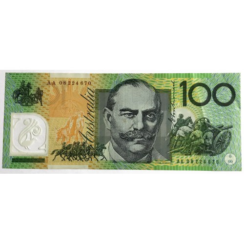 Australia 2008. One Hundred 100 Dollars Banknote. Serial: AA08224670.