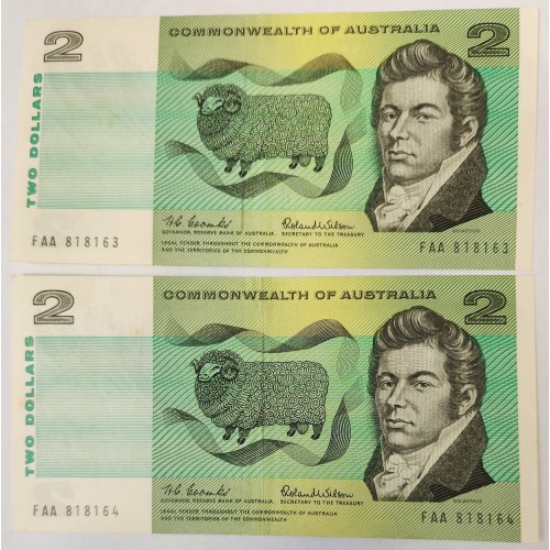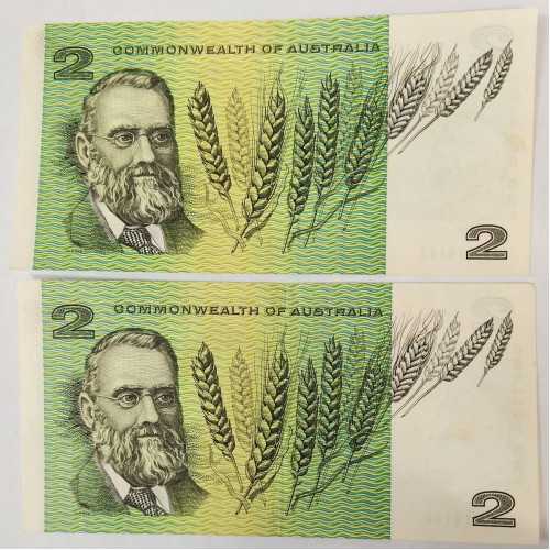 Australia 1966 Two 2 Dollars Banknotes. Serial: FAA818163-4. Coombs/Wilson.