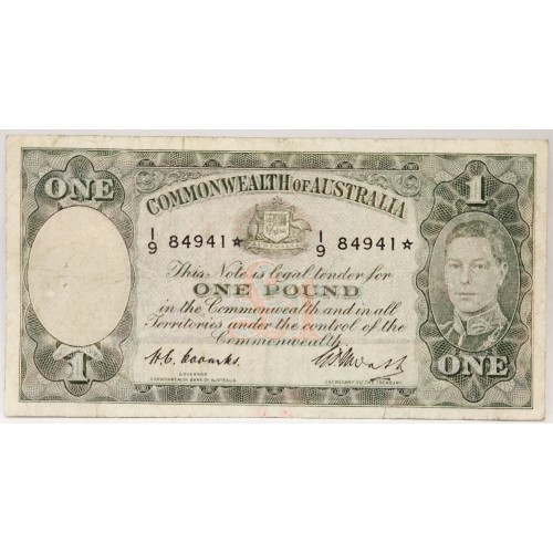 Australia 1949 One 1 Pound Banknote. Serial: I9 84941*. Coombs/Watt. Star