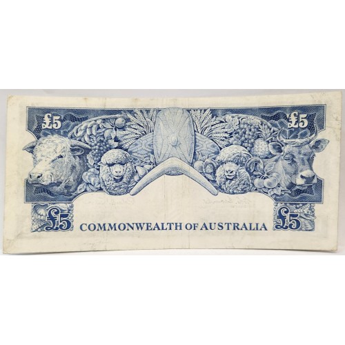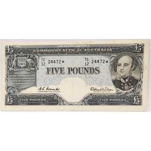 Australia 1960 Five 5 Pounds Banknote. Serial: TC12 24472*. Coombs/Wilson.