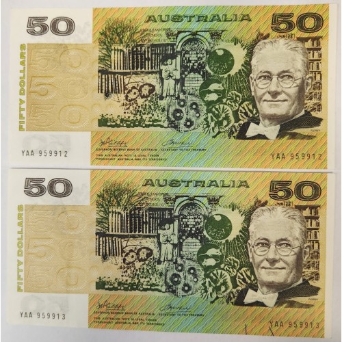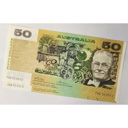 Australia 1973 Fifty 50 Dollars Banknote. Serial: YAA959912-3. Phillips/Wheeler.