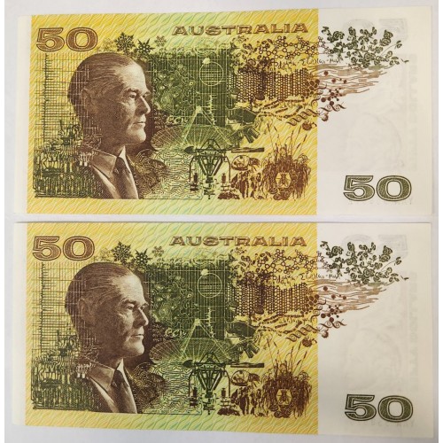 AUSTRALIA 1973 . FIFTY 50 DOLLARS BANKNOTE . PHILLIPS/WHEELER . ERROR . INK TRANSFER . CONSEC PAIR