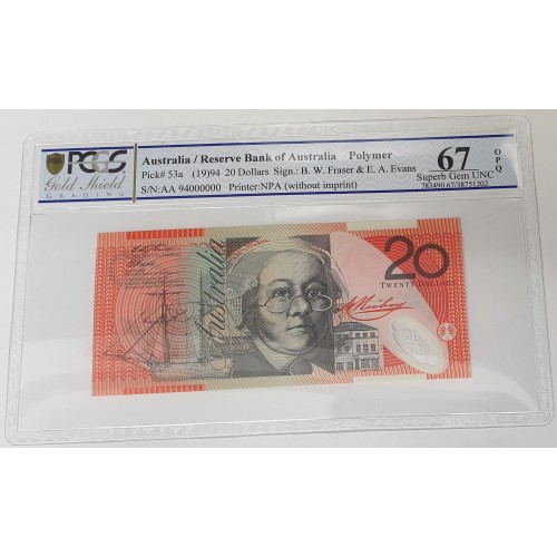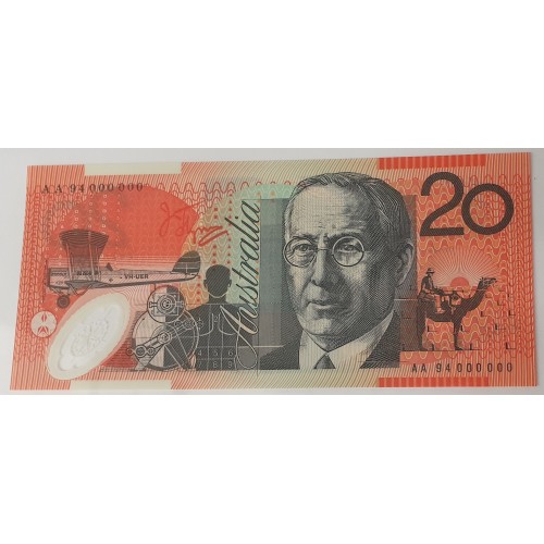 Australia 1994. Twenty 20  Dollars Banknote. Serial: AA 94000000. Evans/Fraser.