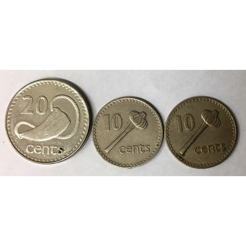 Fiji Coins. 2x 1973 Ten 10 Cents Coins. 1999 Twenty 20 Cents Coin.