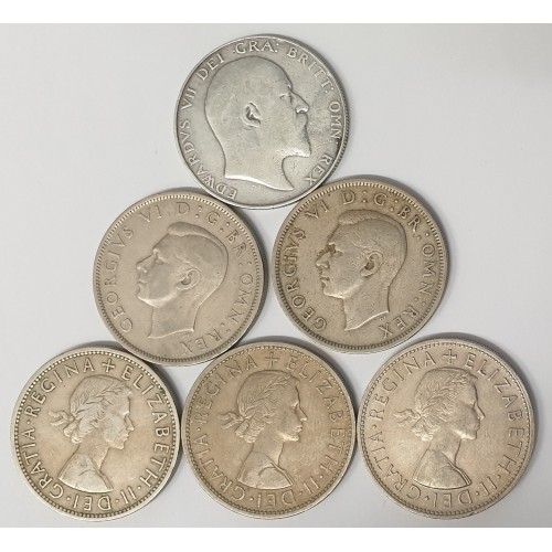 Great Britain UK 1910, 2x 1948, 1954, 1957, 1961. 6 Large Half 1/2 Crown Coins.