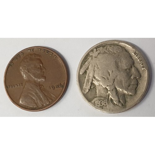 United States of America 1936 One 1 and Five 5 Cent Coins. No Mint Marks.