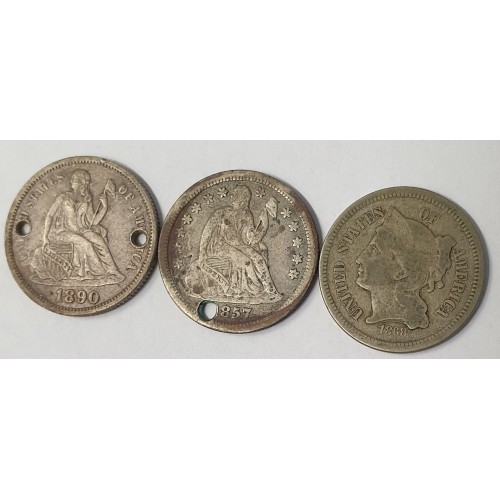 United States of America 1857 and 1890 One 1 Dime Coins. 1868 Three 3 Cents