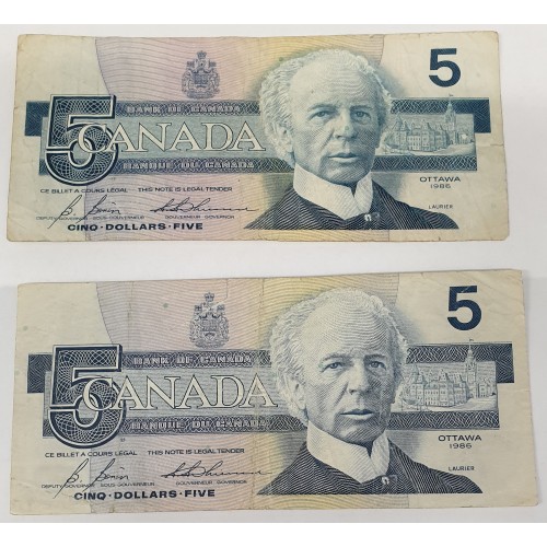Canada 1986. 2x Five 5 Dollar Banknotes. Serial: GOJ1580729, ANE7695609.