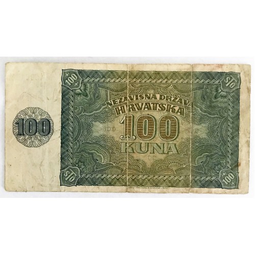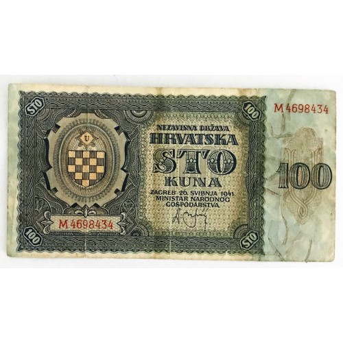 `Croatia 1941. One Hundred 100 Kuna Banknote. Serial: M4698434. aVery Fine