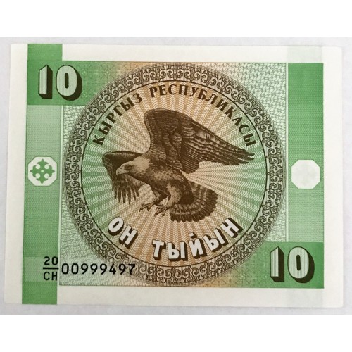 Kyrgyzstan 1993 Ten 10 Tyiyn Banknote. Serial: 20/CH 00999497. Choice