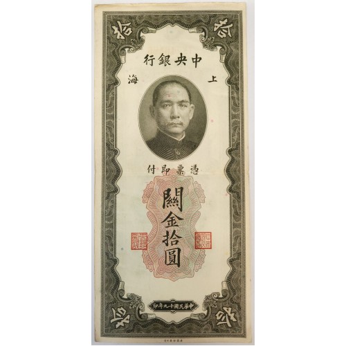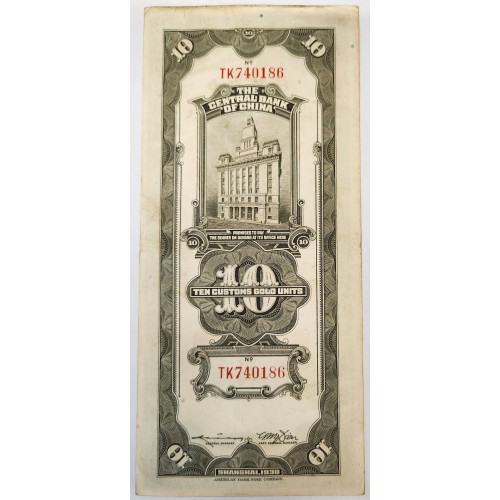 China Republic 1930 Ten 10 Custom Gold Units Banknote. Serial: TK740186.