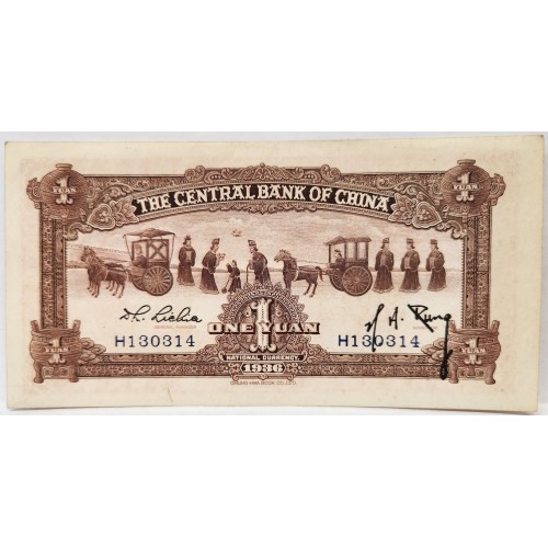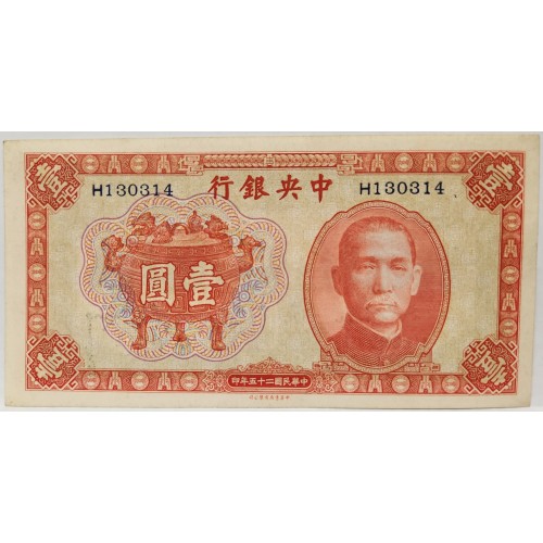 China 1936 One 1 Yuan Banknote. Serial: H130314. Central Bank of China.