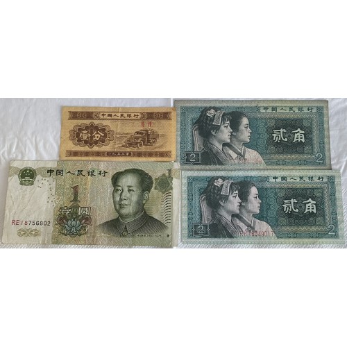 China 1980-1999. One Fen, 2x Two Jiao, One Yuan Banknotes. Serial: VII VII,