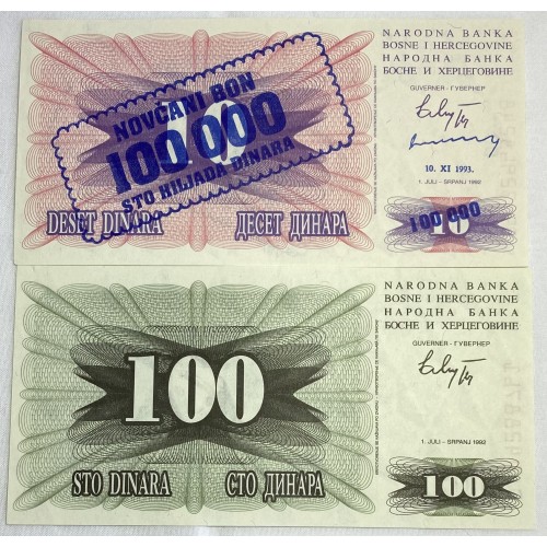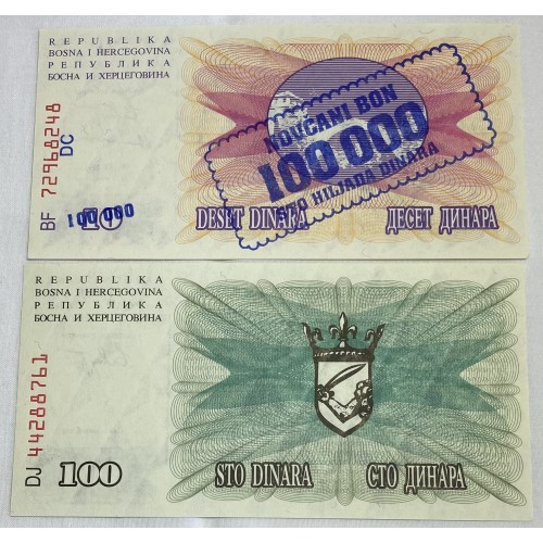 BOSNIA-HERZEGOVINA 1992 . TEN 10 DINARA . OVERPRINT and ONE HUNDRED 100 DINARA BANKNOTES