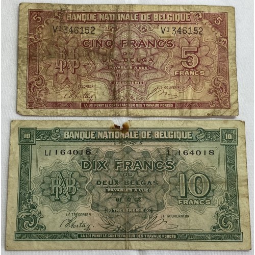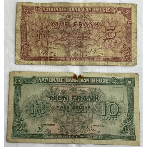 Belguim 1943 Five 5 and Ten 10 Francs Banknotes. Serial: V1346152, LI164018.