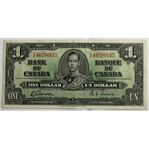 Canada 1937 One 1 Dollar Banknote. Serial: Z/A 4658935. Gordon/Towers