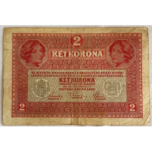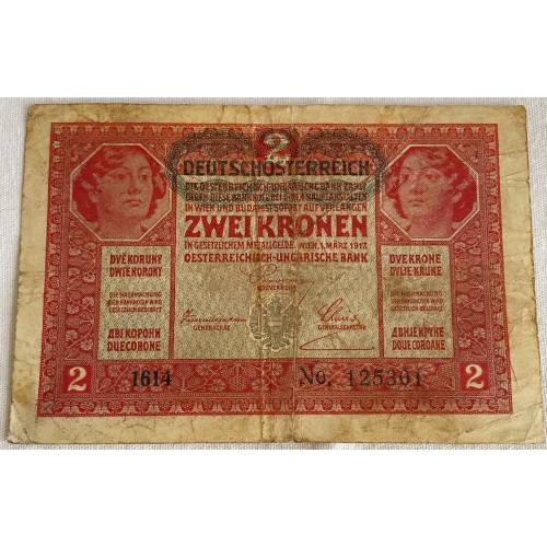 Austria 1917 Two 2 Korona Banknote. Serial: 125301 1614. Key Date. Very
