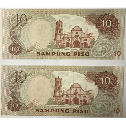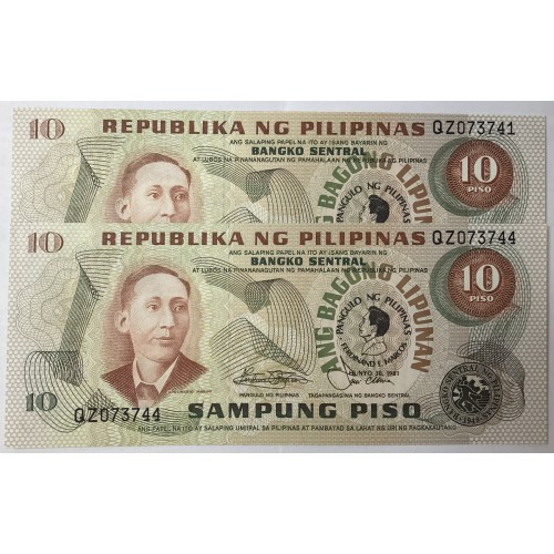 Philippines 1981 Ten 10 Piso Banknotes. Serial: QZ073741, QZ073744.