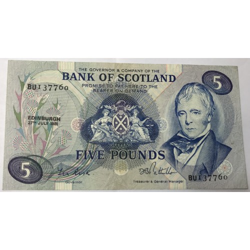Scotland 1984 Five 5 Pounds Banknote. Serial: BUI37760. Bank of Scotland.