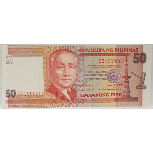 Philippines 1999 Fifty 50 Piso Banknote. Serial: CD1000000. Sign: Ramos/