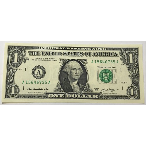 UNITED STATES OF AMERICA 2013 . ONE 1 DOLLAR BANKNOTE . PREFIX A and SUFFIX A