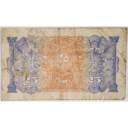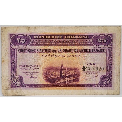 Lebanon 1942 Twenty-Five 25 Livres Banknote. Serial: A/4 257.320. Republic