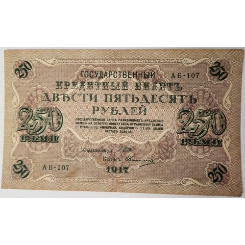 1917 Two Hundred and Fifty 250 Rubles Banknote. Serial: Ab-107.