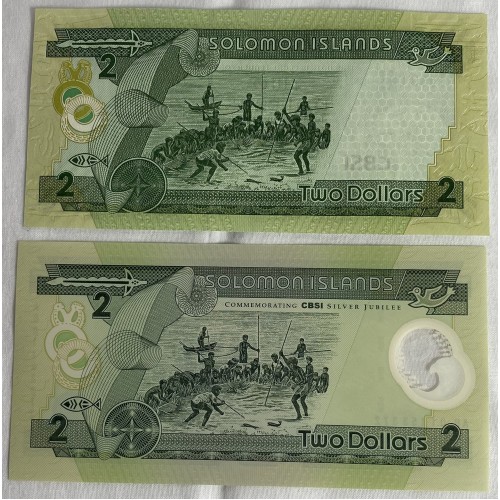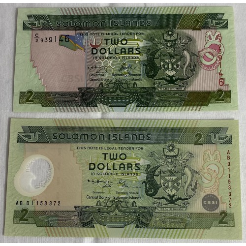 Solomon Islands 1997-2001 2x Two 2 Dollars Banknotes. Serial: C/2 939146,