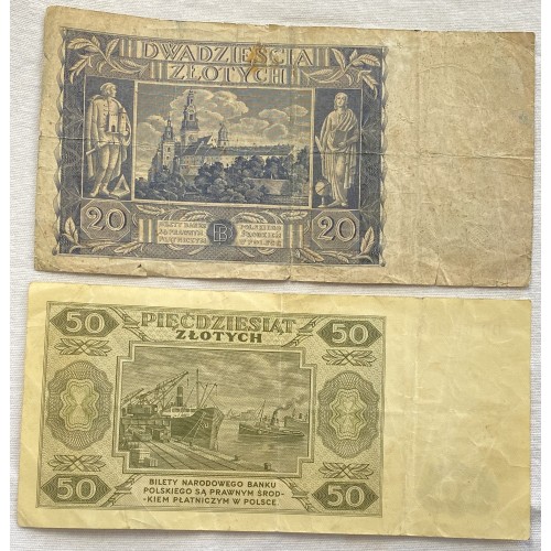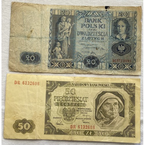 POLAND 1936 - 1948 . TWENTY 20 - FIFTY 50 ZLOTYCH BANKNOTES