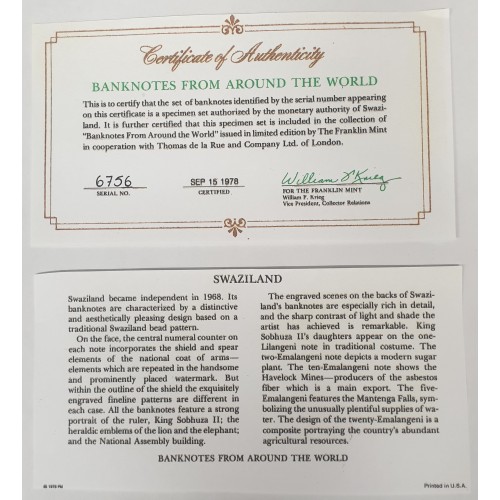 Swaziland 1978 One 1 - Twenty 20 Emalangeni Banknotes. Serial: *006756.