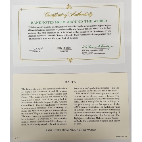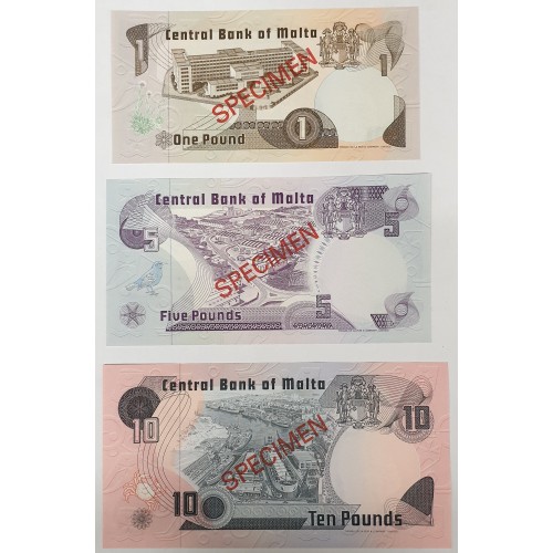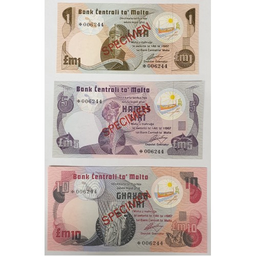 Malta 1967 One 1 - Ten 10 Lira Banknotes. Serial: *006244. Specimen.