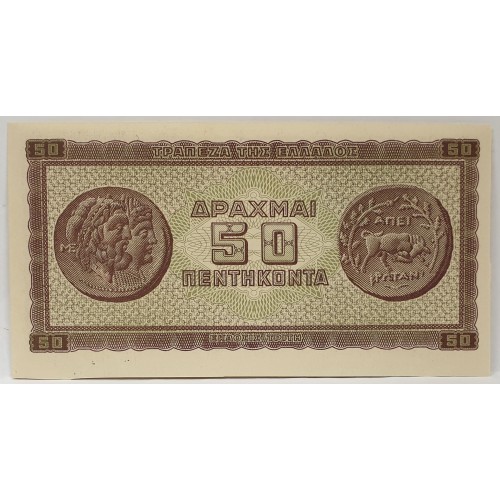 Greece 1943. Fifty 50 Drachmai Banknote. No Serials. Specimen. Very Scarce.