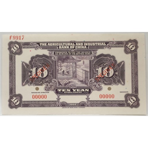 China 1932 Ten 10 Yuan Banknote. Serial: F9917 00000. Sepecimen. Uni-face.