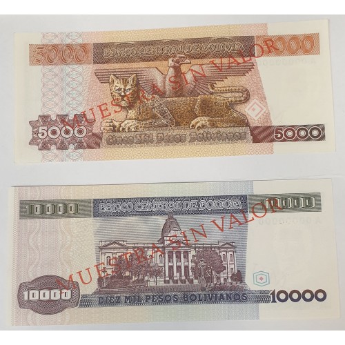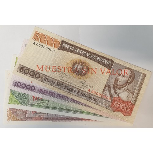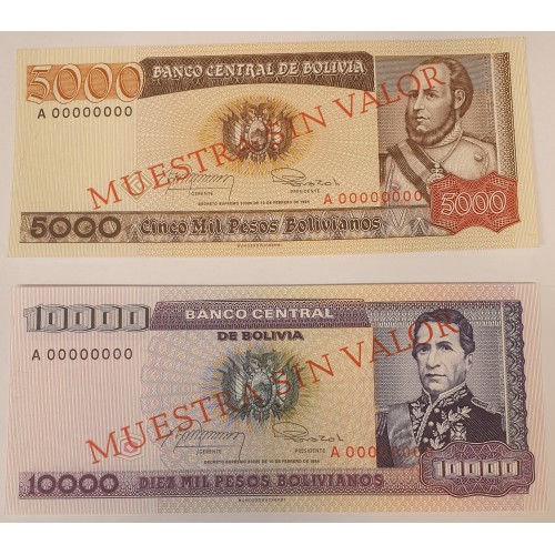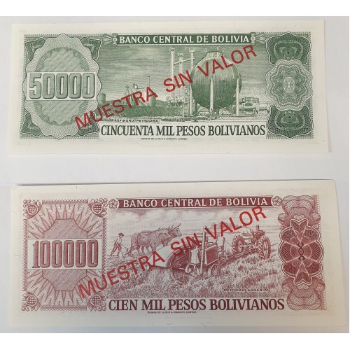 BOLIVIA 1984 . FIVE THOUSAND 5,000 - ONE HUNDRED THOUSAND 100,000,000 PESOS BOLIVIANOS BANKNOTES . SPECIMEN